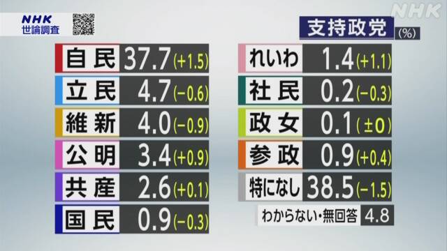 政党支持率は、自民党24%(前回23%)▽日本維新の会14%(同13%)▽立憲民主党9%(同11%)▽れいわ新選組7%(同5%)▽共産党6%(同4%)▽国民民主党5%(同5%)▽公明党3%(同4%)▽参政党2%(同3%)――... (略)