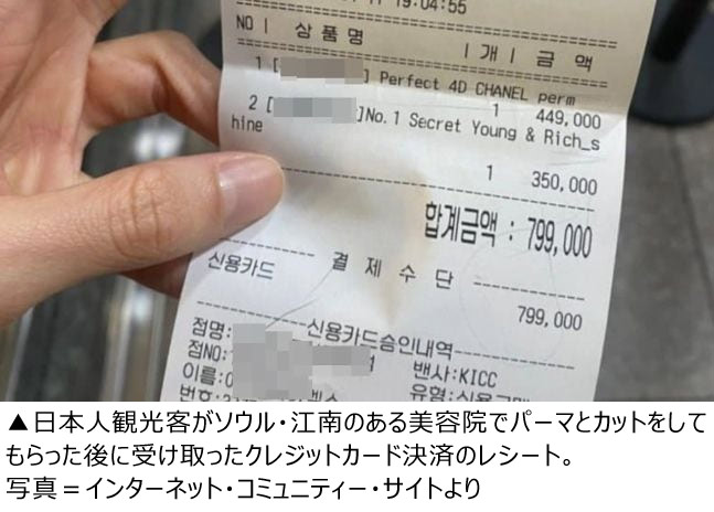 韓国を訪れた日本人観光客がソウル・江南の美容院で予想を上回る料金を支払ったという話がインターネット上に掲載された。