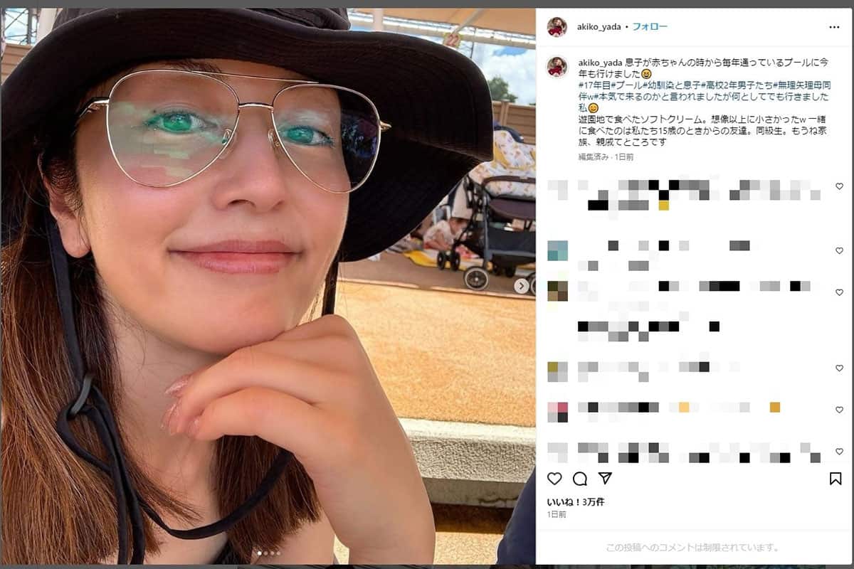 矢田は、プールサイドでの写真とともに《息子が赤ちゃんの時から毎年通っているプールに今年も行けました》と投稿。