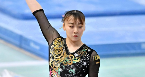 最初の種目・跳馬が始まる前には、胸に手を当てて深呼吸し、目元をぬぐうなど涙の復帰戦。