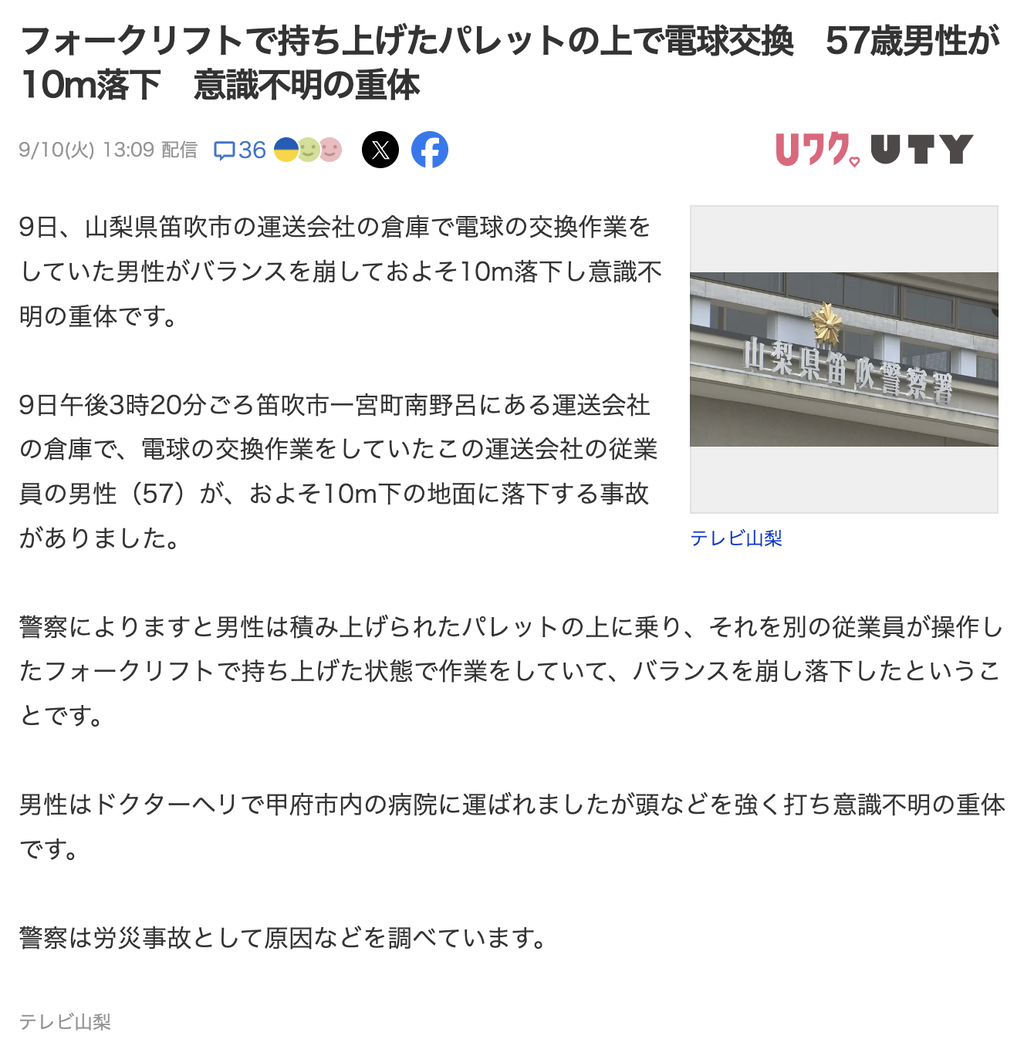 フォークリフトで持ち上げたパレットの上で電球交換 57歳男性が10m落下 意識不明の重体