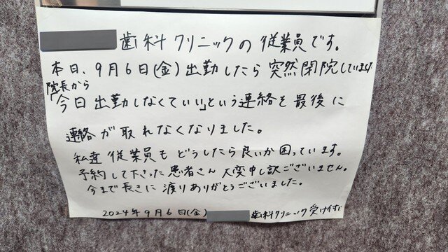 「歯科クリニックの従業員です。本日9月6日(金)出勤したら突然閉院していました。院長から『今日出勤しなくていい』という連絡を最後に連絡が取れなくなりました。私達従業員もどうしたら良いか困っています。予約して下さった患者さん大変申し訳ございません。今まで長きに渡りありがとうございました」