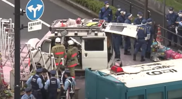 NHKによると、容疑者が運転していたワンボックスカーの車内には、10個ほどのポリタンクや未使用の火炎瓶のようなものが数本あったという。
