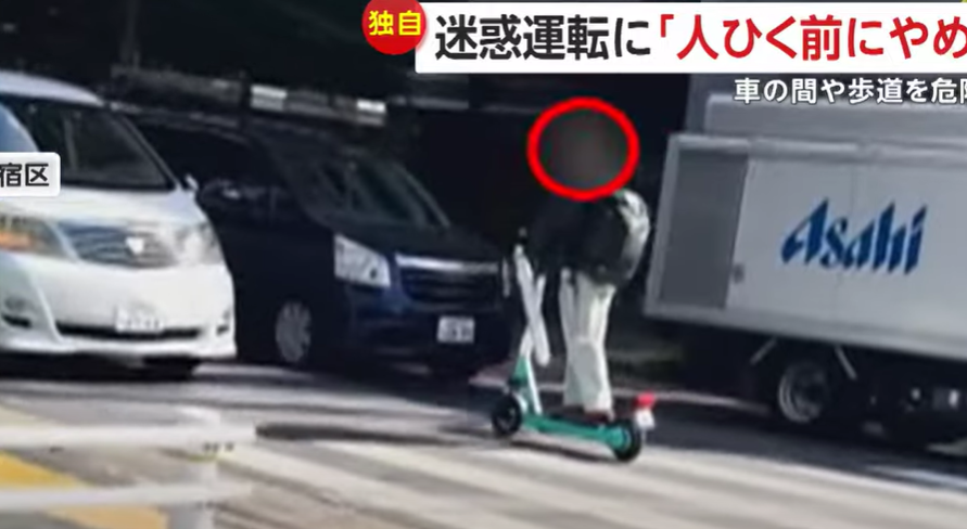 東京・新宿区の交差点でカメラが捉えたのは、車と車の間を逆走する“無謀運転”電動キックボード。
