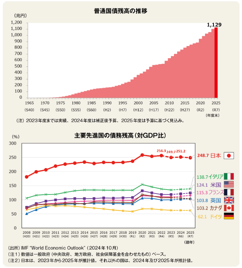 普通国債残高は、累増の一途をたどり、2025年度末には1,129兆円に上ると見込まれています。